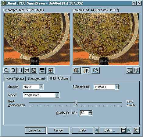 Images can be resized or cropped, and specific areas can be kept sharp (emphasised). For GIFs, more than one colour or area can be selected to be transparent. SmartSaver also enables the user to optimise the images across and entire Web site.
